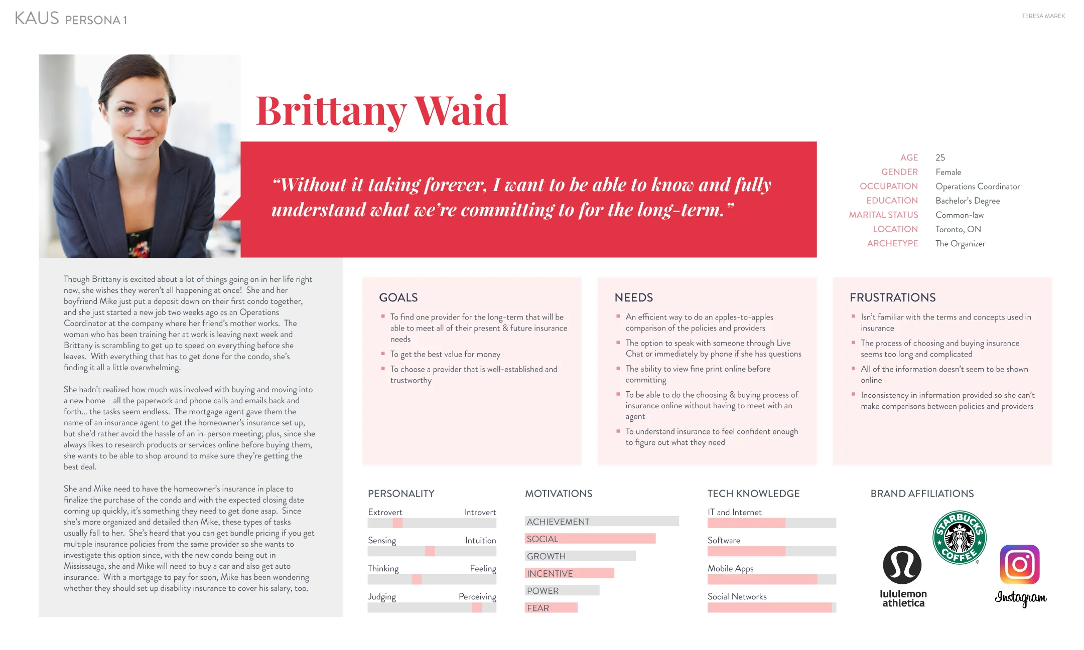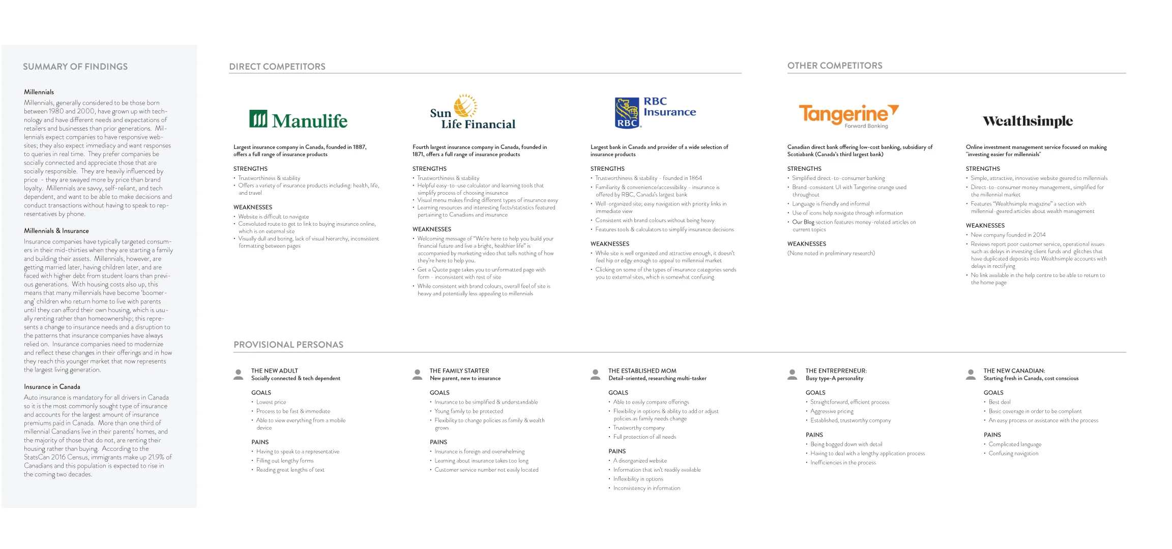I began my process with secondary research to gain an understanding of the target market, the industry and its trends. I wanted to learn about the millennial market, millennial behavioural and life patterns that would affect their decision-making for insurance, as well as research on insurance in Canada.