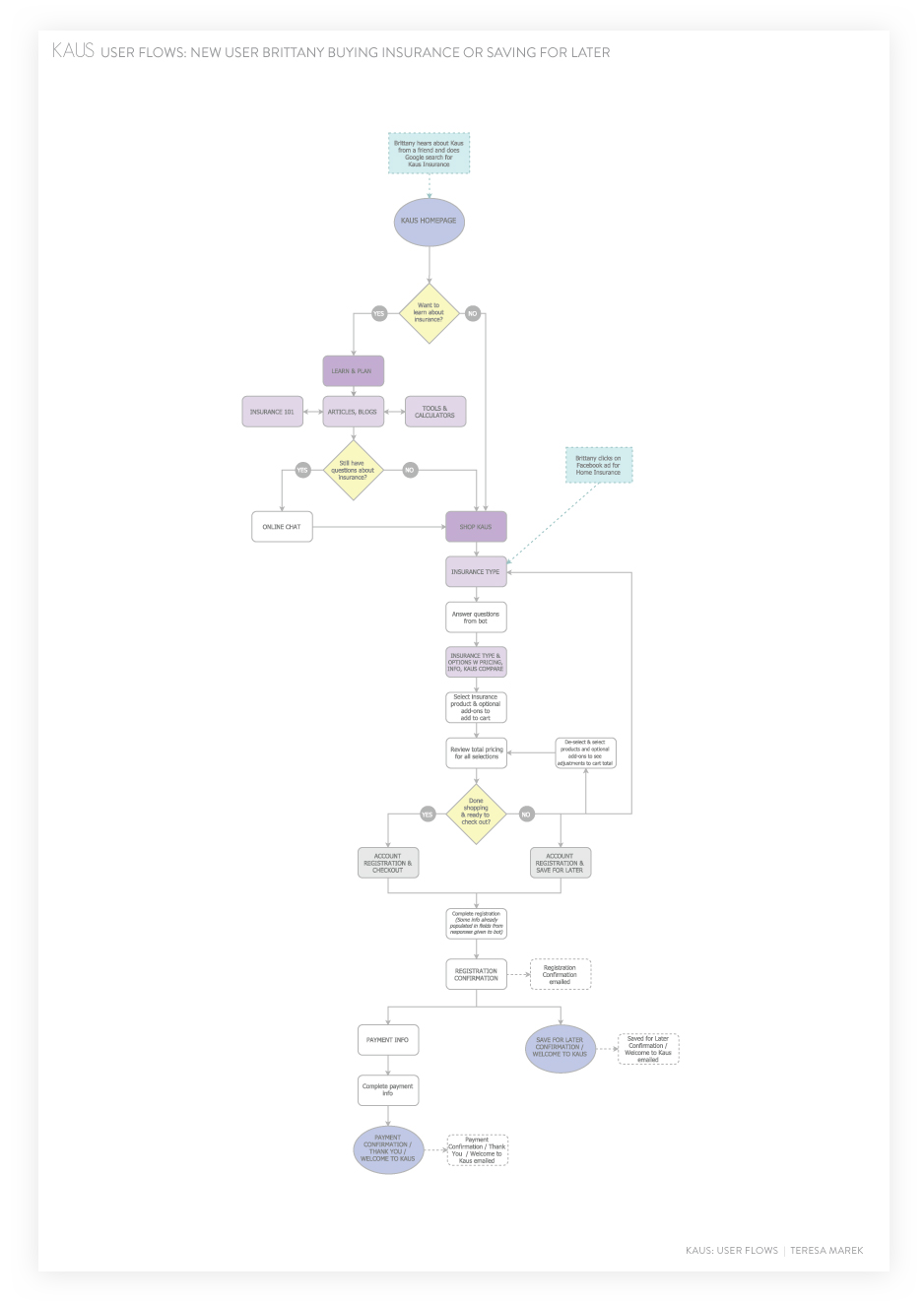 After developing the sitemap, I mapped out the common user flows of a new user: Arriving to the website via different avenues and landing on different pages, using the learning resources and planning tools, registering an account, completing a purchase of insurance, or saving an insurance quote for later.