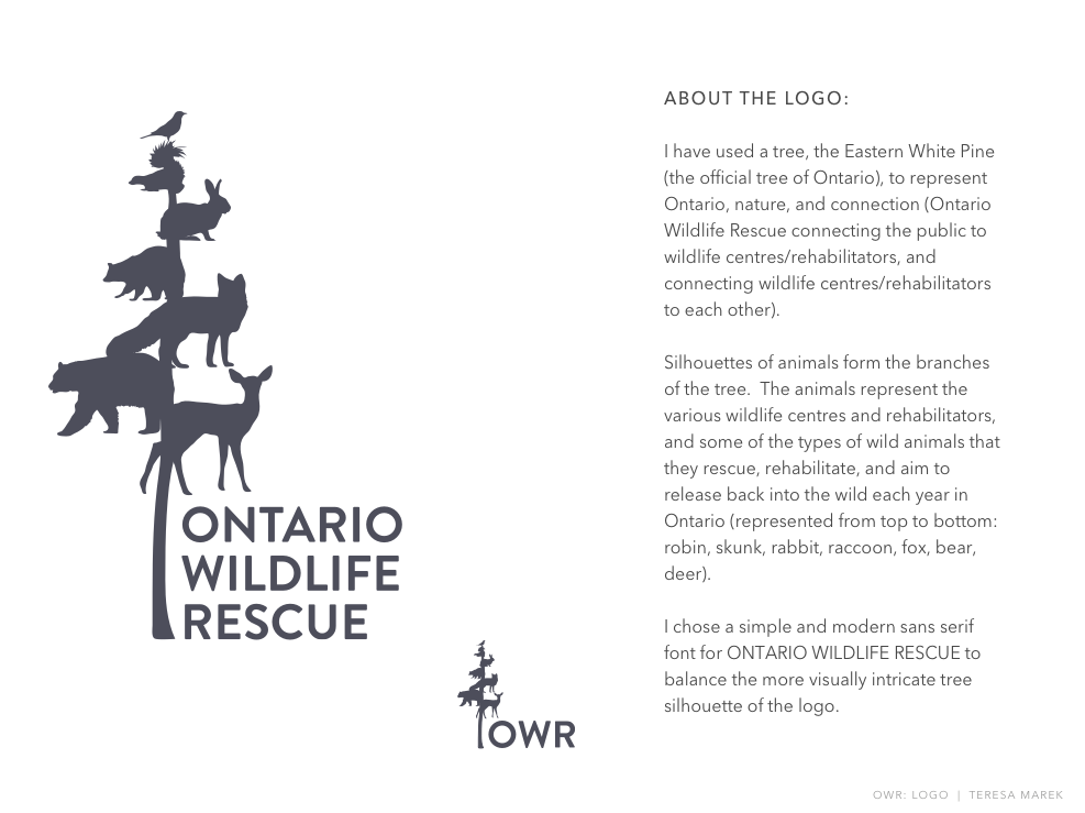 Ontario Wildlife Rescue did not previously have a logo so I created one using the Eastern White Pine and the silhouettes of Ontario wild animals to represent Ontario, wildlife, nature, and the concept of connection.