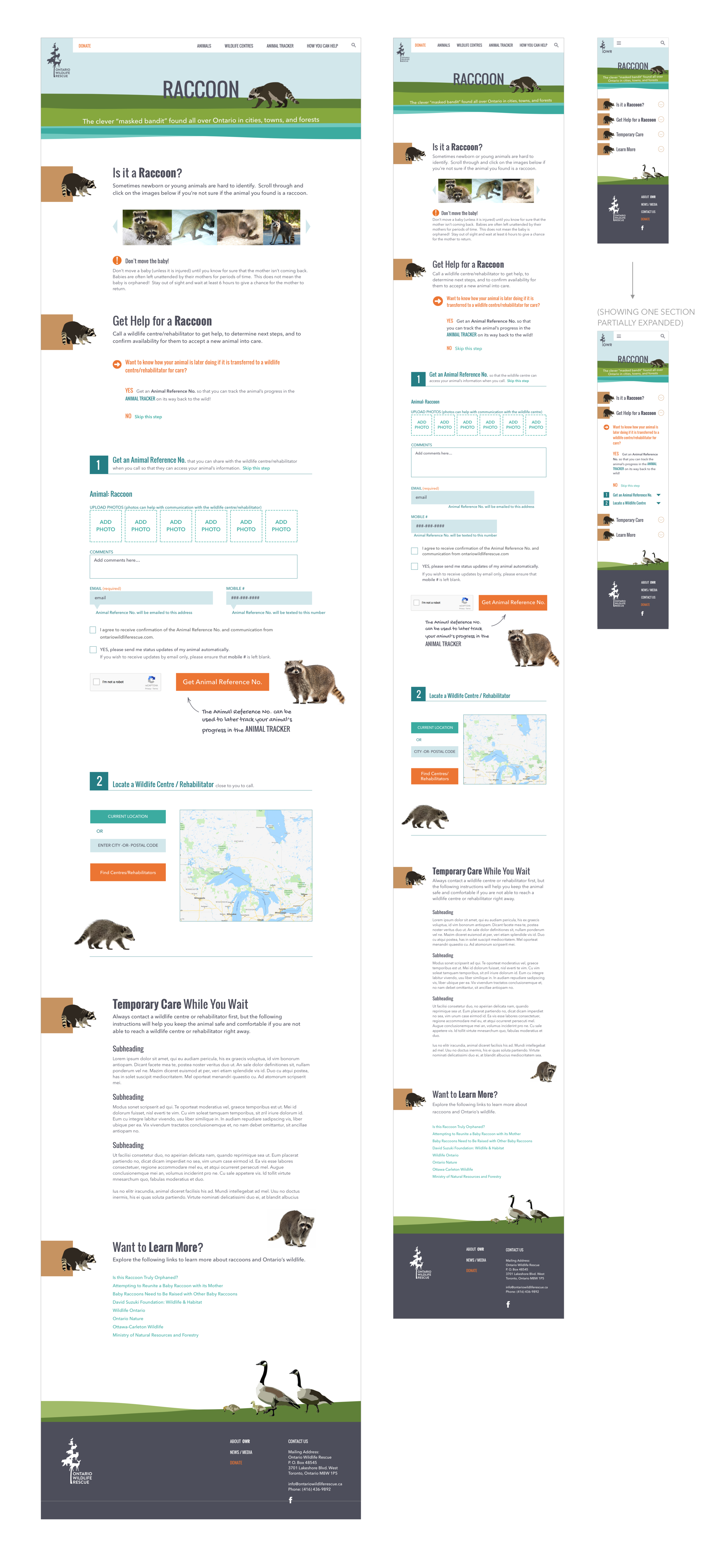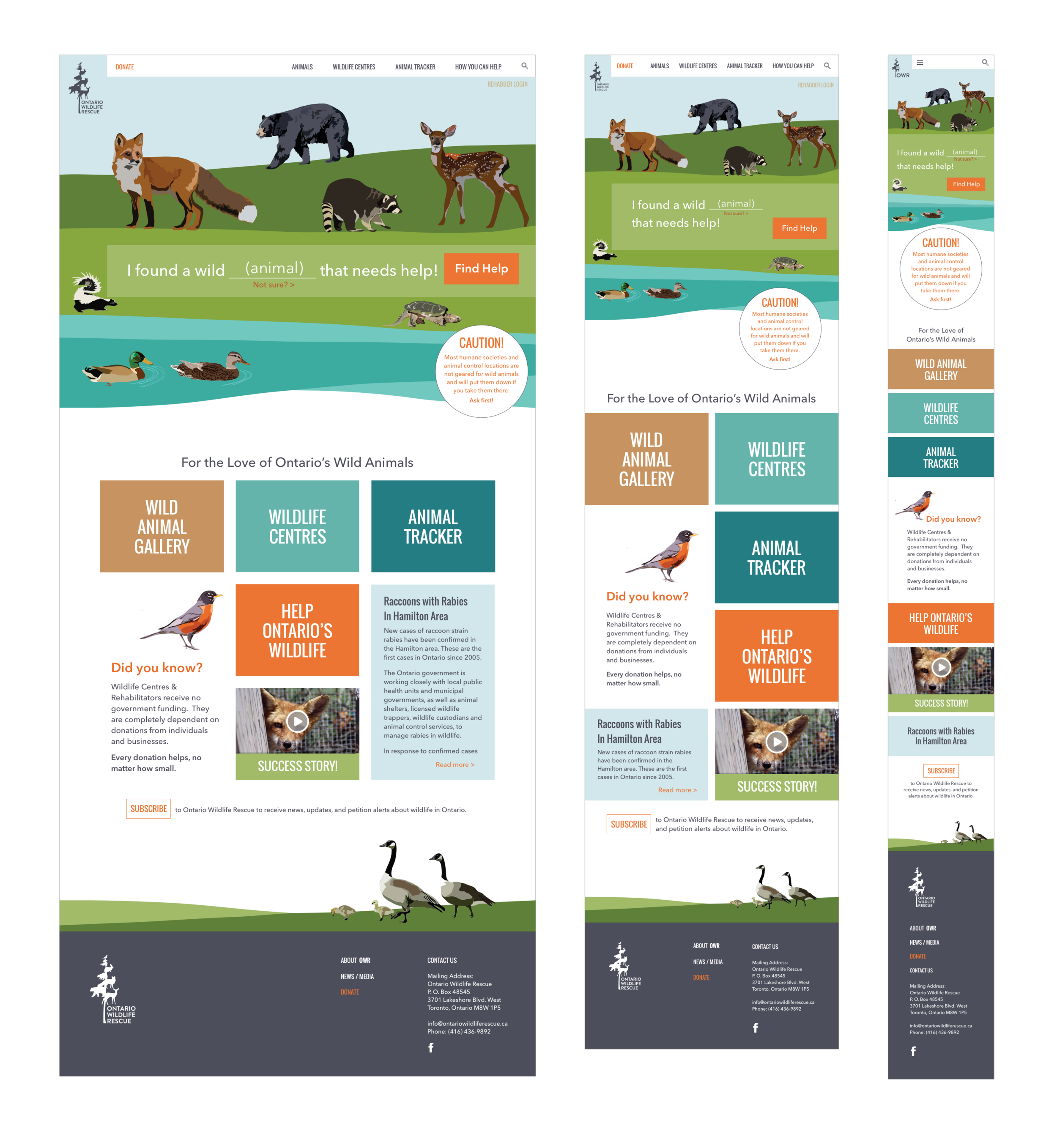 With iterations completed on the existing pages in the prototype, next steps would include building out the other animal type pages and the remaining sections of the website: Wild Animal Gallery, Wildlife Centres, How to Help Wildlife, Current News, Success Stories, the pages specific to Ontario Wildlife Rescue (About, News/Media, and Donate), and the logged-in section specific to wildlife rehabilitators.
